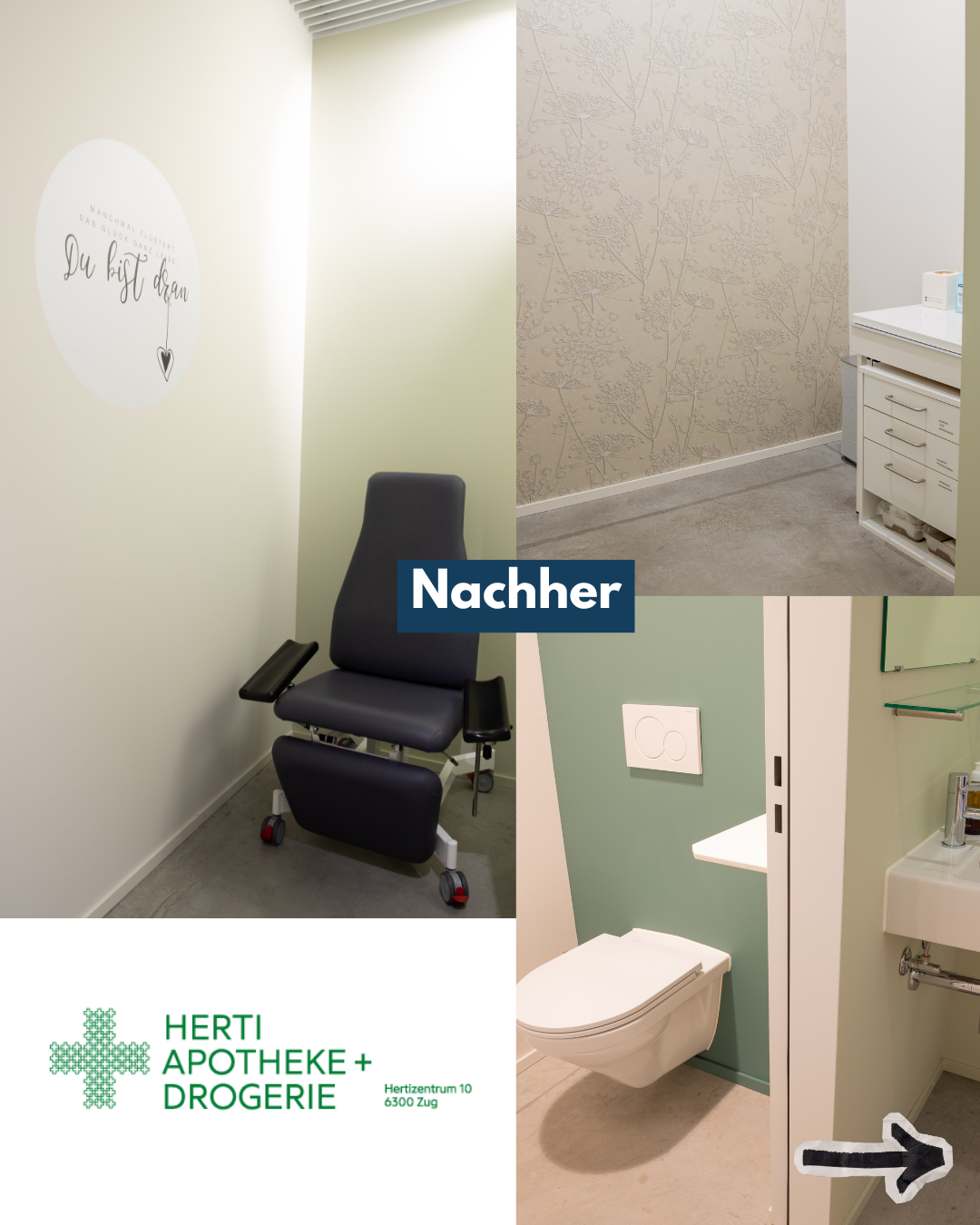 Martina Gisler, Inhaberin der Herti Apotheke und Drogerie, sagt dazu: « Unserer Beratungsräume sind dank der Beratung und den ausgeführten Arbeiten zu einem richtigen «Hingucker» geworden. Nicht nur wir, sondern auch unsere Kunden fühlen sich wohl. Es macht Spass, in dieser Atmosphäre zu arbeiten.»