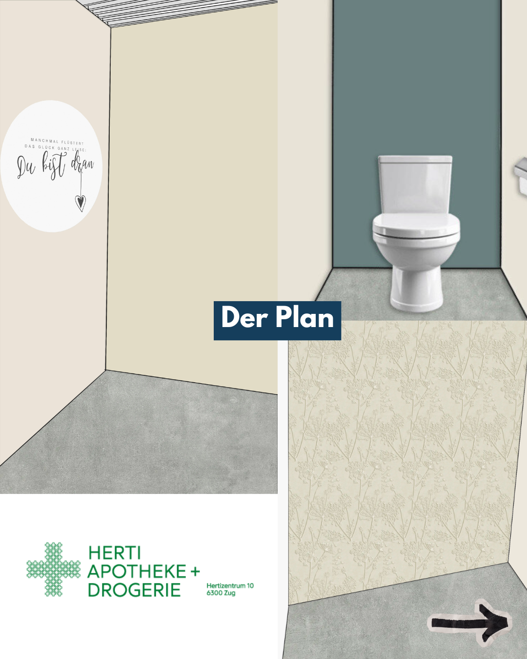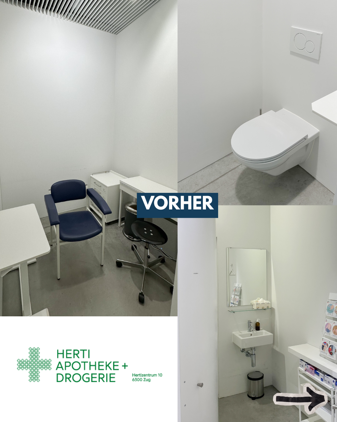 Die Herti Apotheke hat kompakte, aber verhältnismässig hohe Räume. Zwei Behandlungsräume links und rechts sowie eine Toilette im rechten Behandlungsbereich. Der hohe Weissanteil liess alles funktional und kühl wirken. Emotionale Orientierung fehlte.