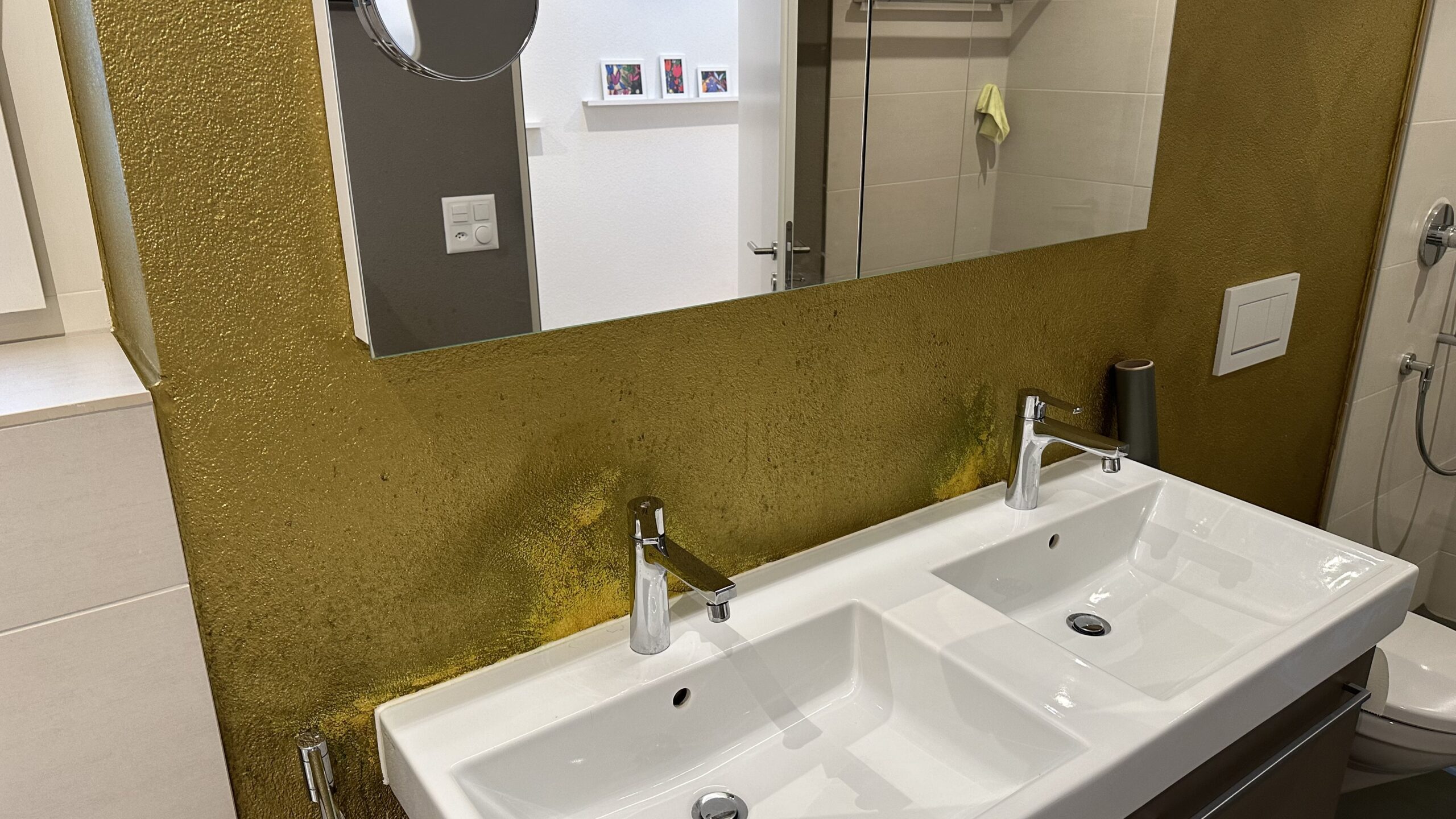 Wir haben mit diesen aussergewöhnlichen Farben unter anderem ein Badezimmer, ein Schlafzimmer und einen Eingangsbereich neu gestaltet. Die Verwendung von Gold, und schimmerndem Anthrazit hat diesen Räumen nicht nur Glanz, sondern auch eine ganz besondere Raumatmosphäre verliehen.