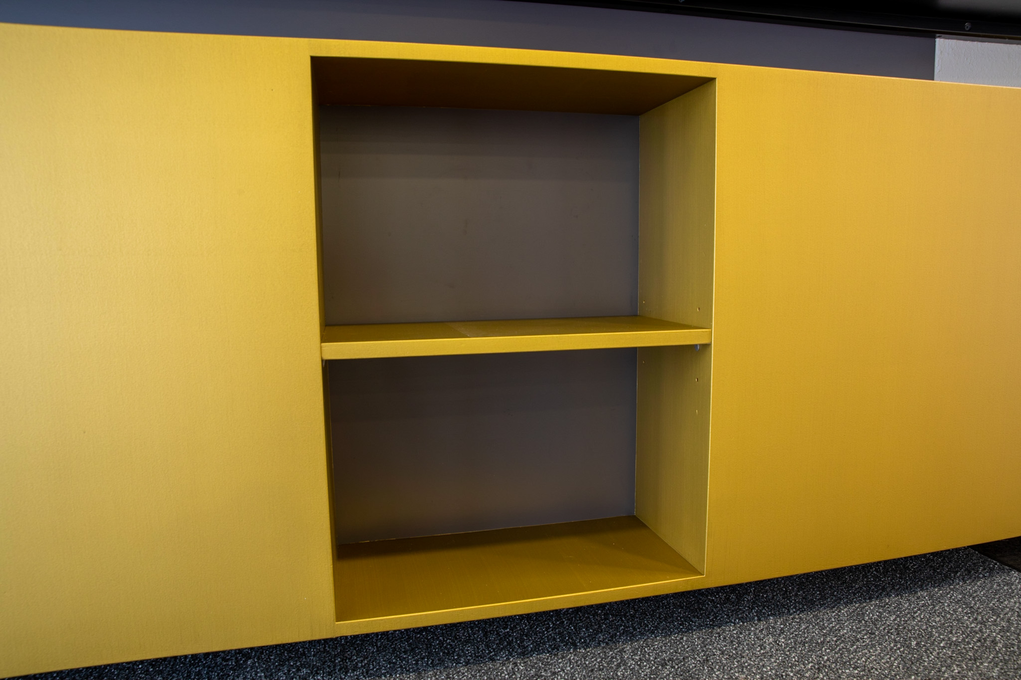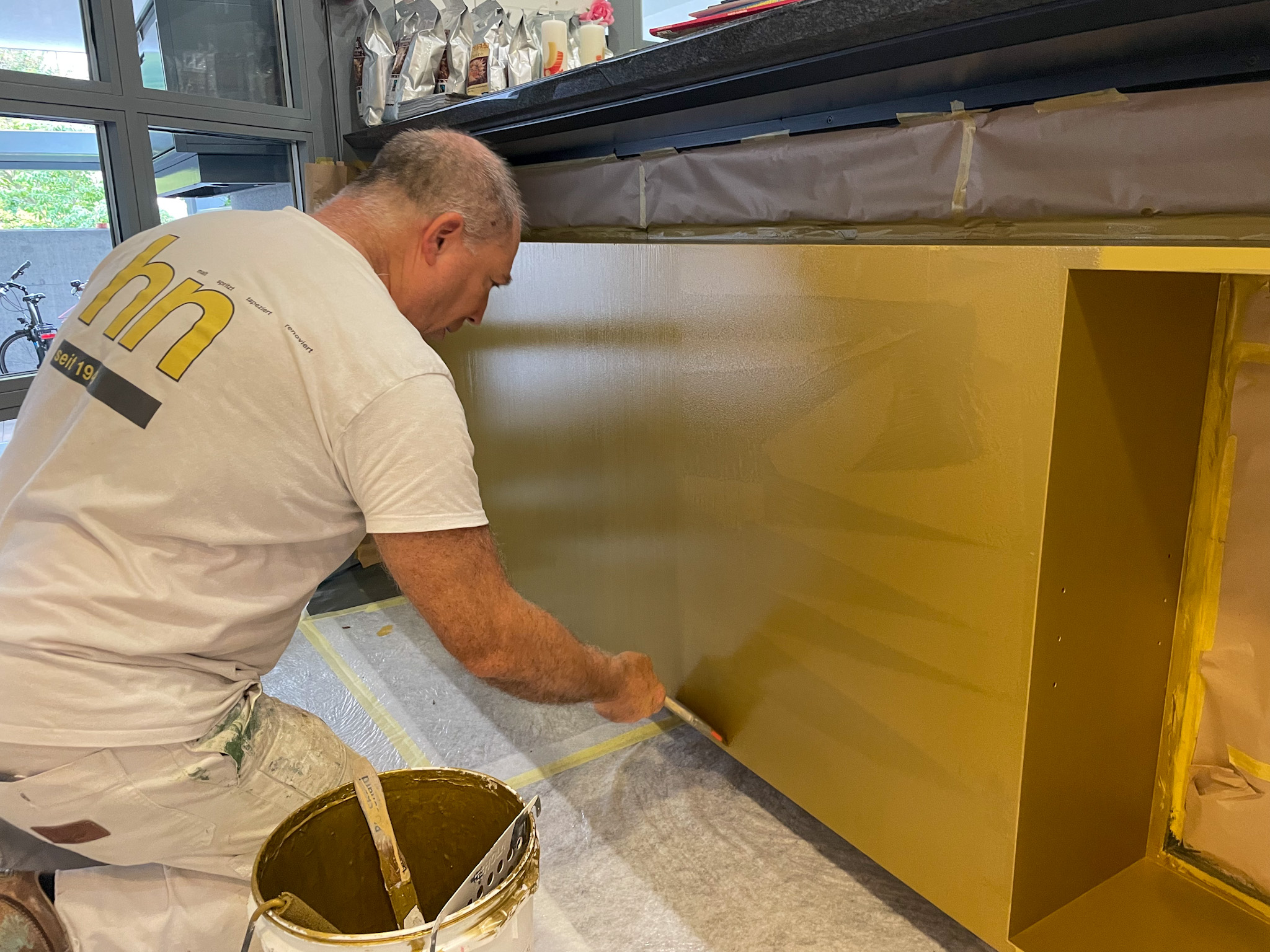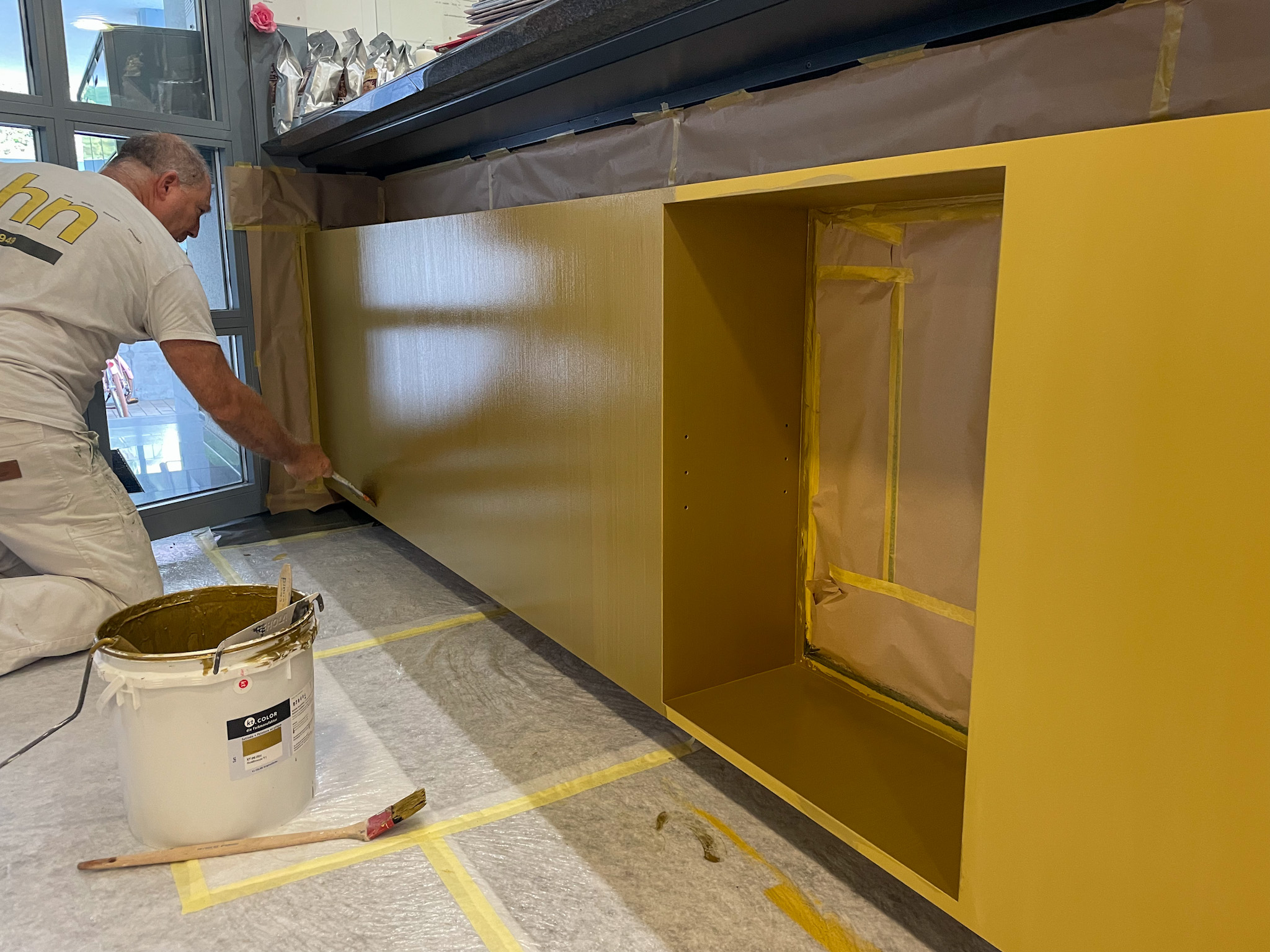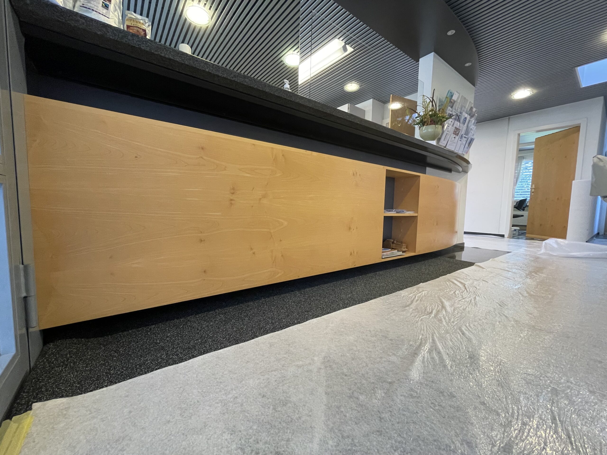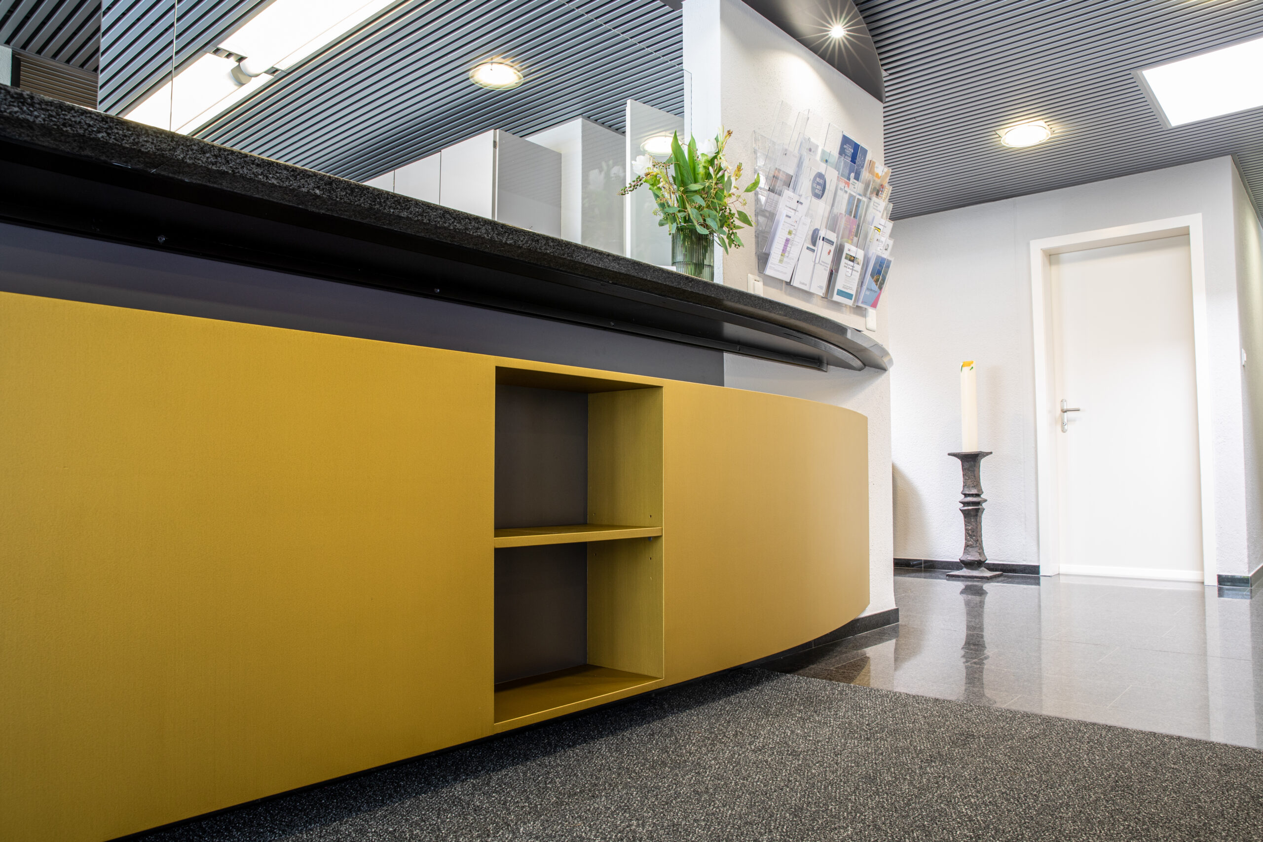 Mit der goldenen Metallicfarbe von KT.Color haben wir diesen Eingangsbereich ohne grossen Aufwand aufgewertet und einen spannenden Kontrast zu dem bestehenden dunklen Tresen und Boden kreiert. So fühlen sich die Besucher:innen und Mitarbeitenden in der Pfarrei St. Martin in Baar direkt willkommen in den Räumen. Hier entlang, um das ganze Projekt anzuschauen.