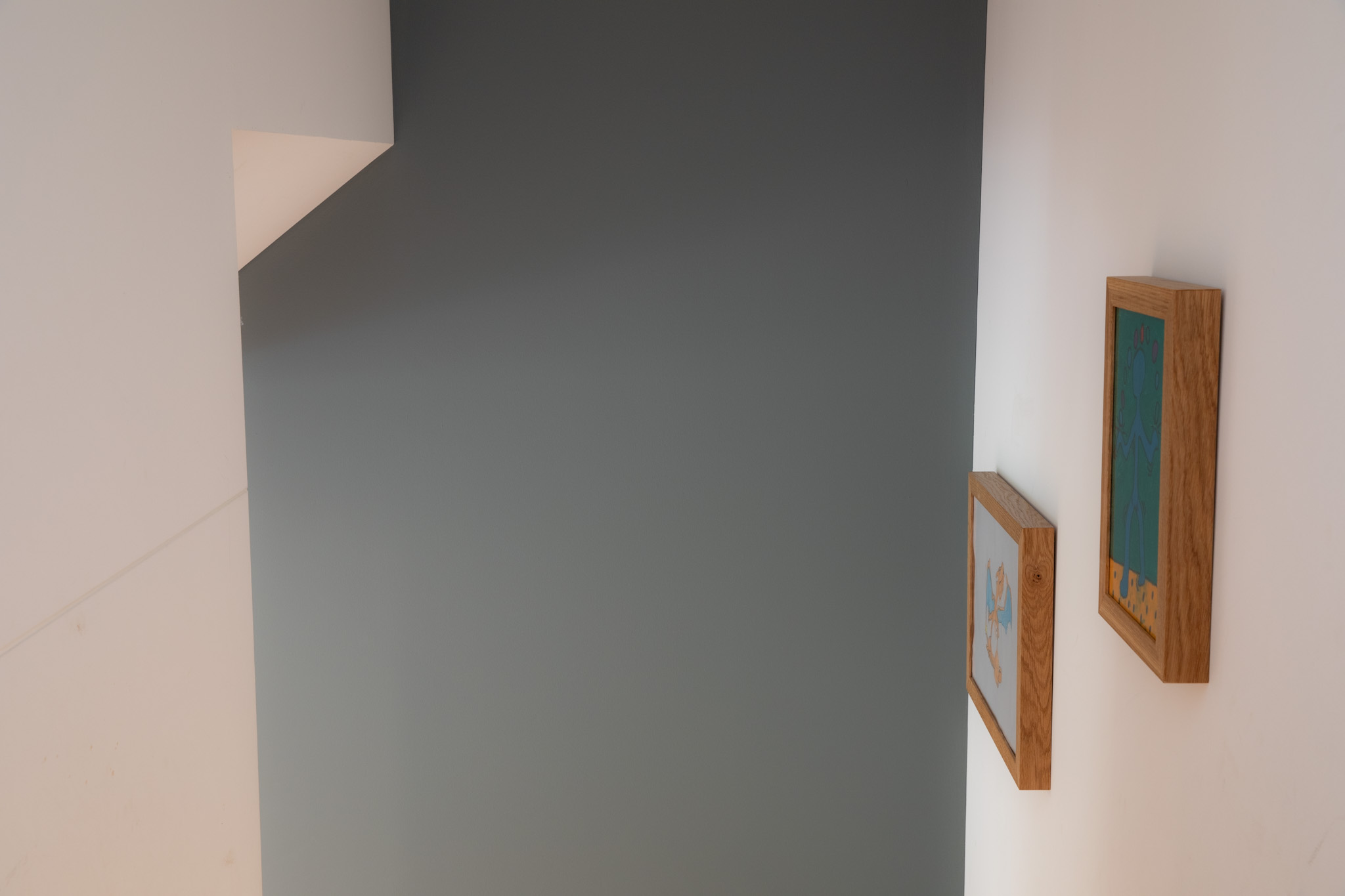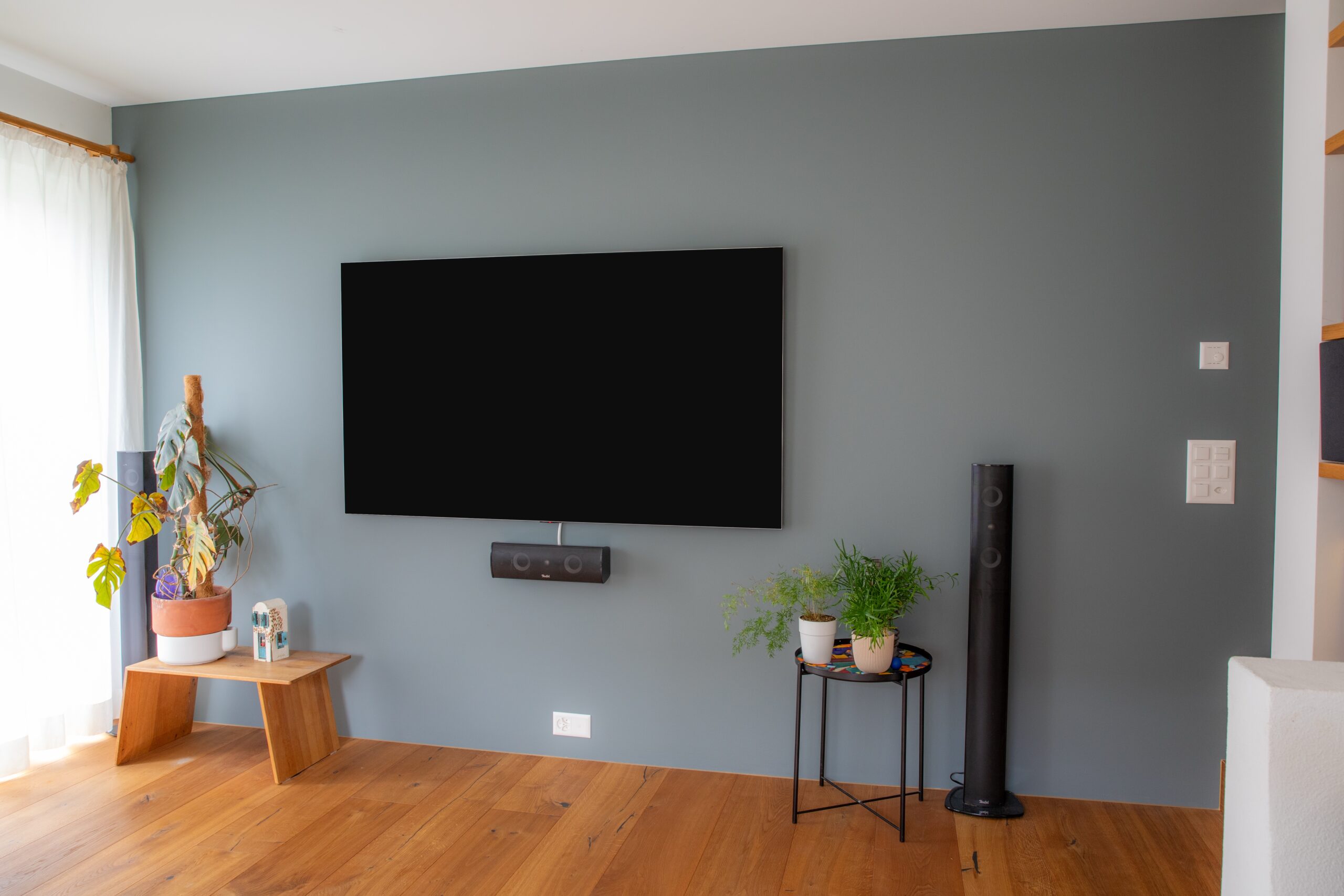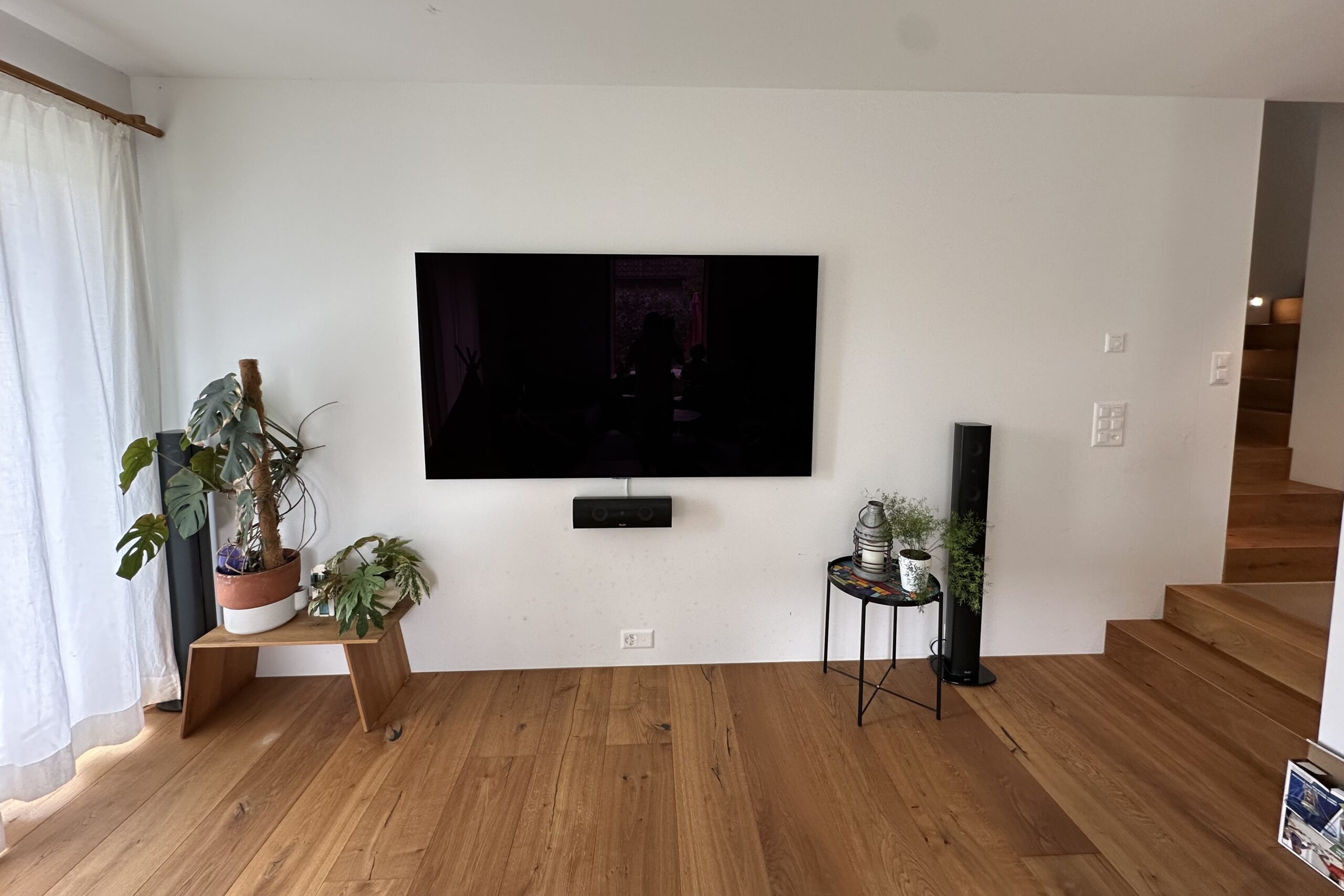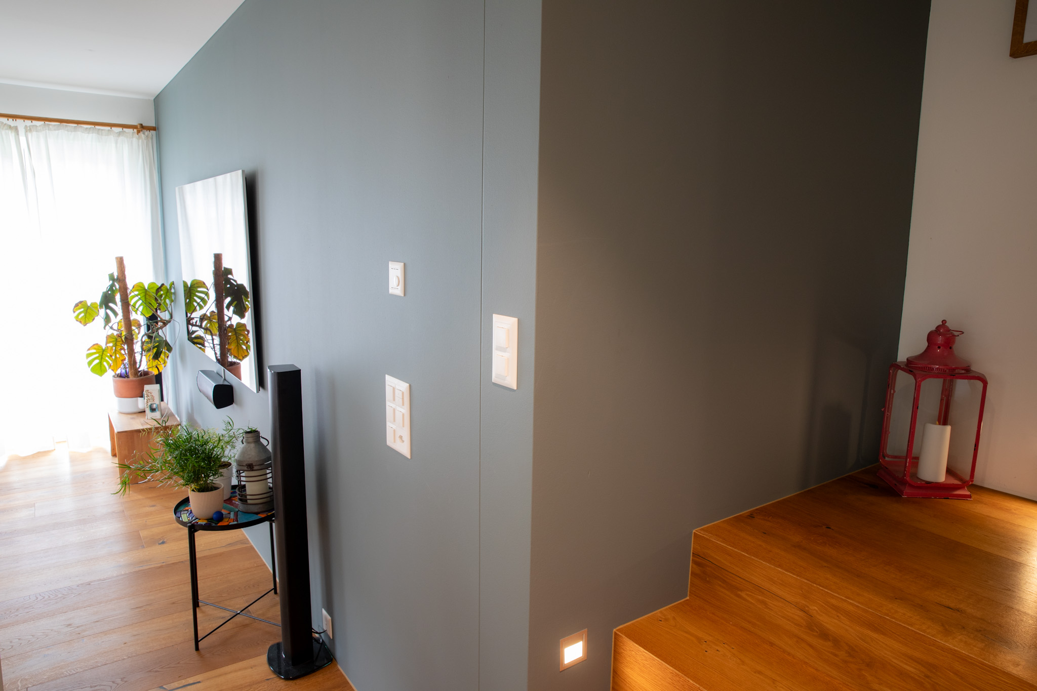 In diesem Wohnzimmer wurde der Ton hinter dem Fernseher eingesetzt, um den Bereich dezent zu beruhigen, und setzt sich ums Eck ins Treppenhaus fort. So entsteht ein fliessender Übergang, der dem Raum Ruhe, Stabilität und einen stimmigen Abschluss verleiht.