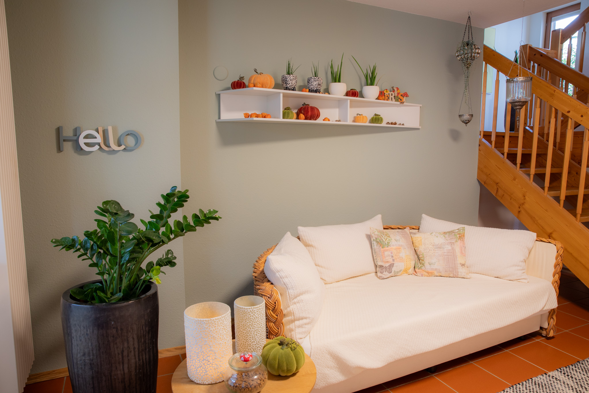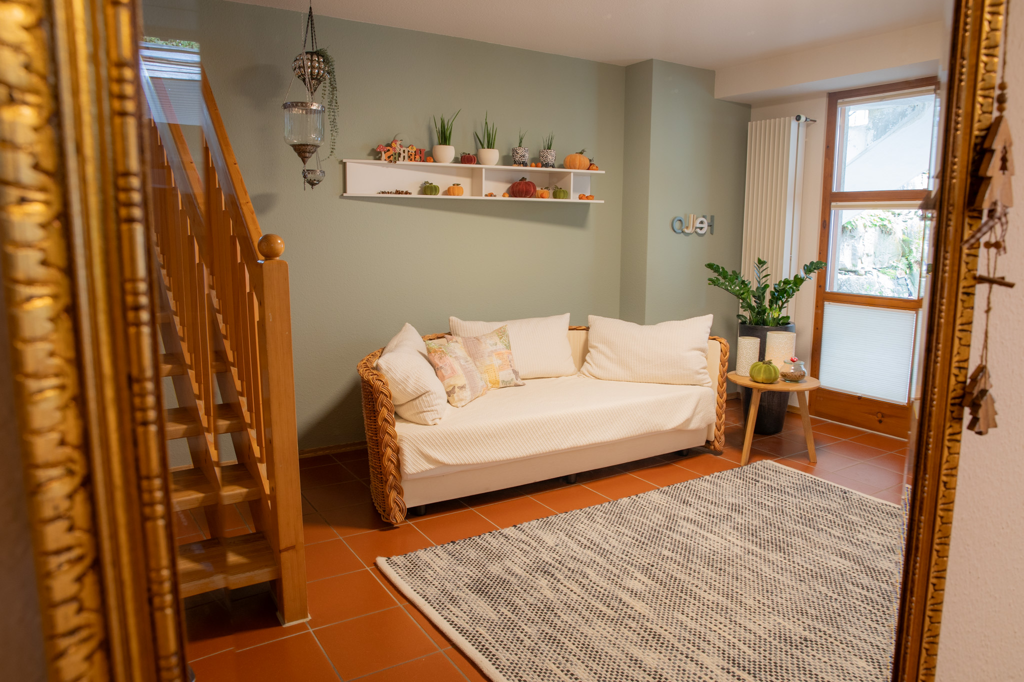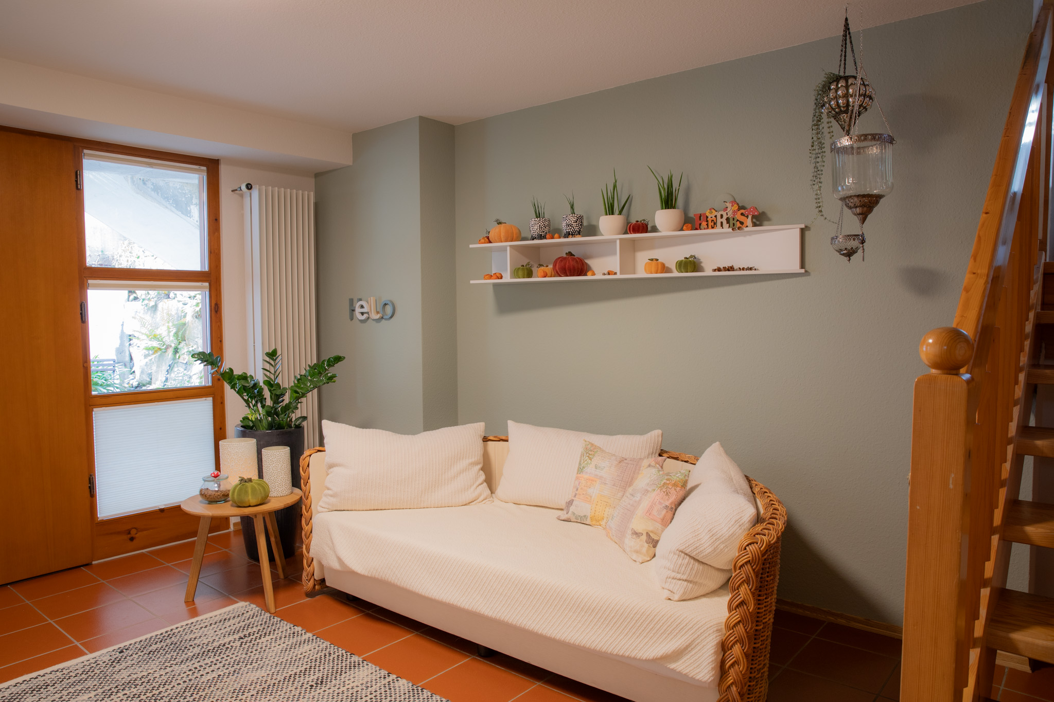 Der Eingangsbereich präsentiert sich nun als harmonische Einheit. Ein abgetöntes Warmweiss verbindet sich mit dem Terracotta-Boden zu einer einladenden Atmosphäre. Die vergraute, grünliche Akzentwand setzt einen eleganten Kontrast und verleiht dem Raum Tiefe und Charakter.